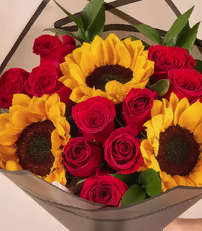 ¡El más pedido de 2024 y 2025! Precioso ramo de 12 rosas rojas con 3 radiantes girasoles. Envío a domicilio en Quito